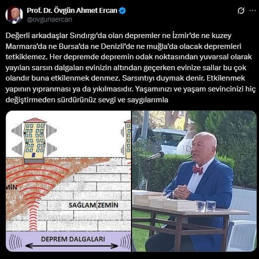“Değerli arkadaşlar Sındırgı‘da olan depremler ne İzmir’de ne kuzey Marmara’da ne Bursa’da ne Denizli’de ne muğla’da olacak depremleri tetkiklemez. Her depremde depremin odak noktasından yuvarsal olarak yayılan sarsın dalgaları evinizin altından geçerken evinize sallar bu çok olandır buna etkilenmek denmez. Sarsıntıyı duymak denir. Etkilenmek yapının yıpranması ya da yıkılmasıdır. Yaşamınızı ve yaşam sevincinizi hiç değiştirmeden sürdürünüz sevgi ve saygılarımla”